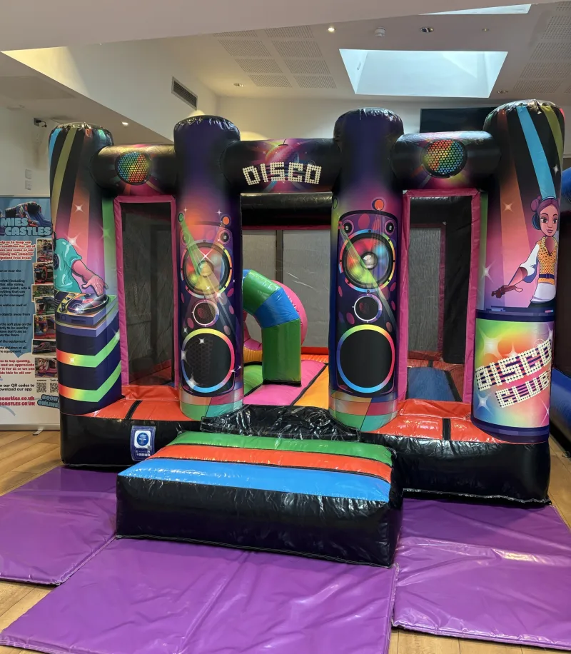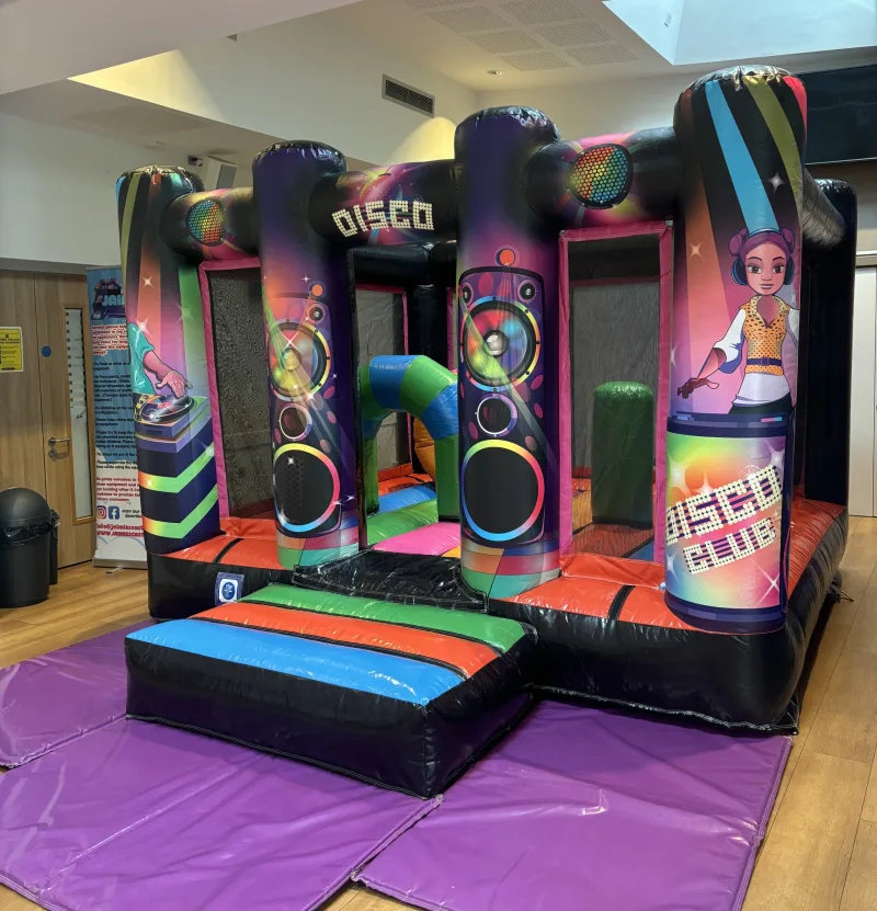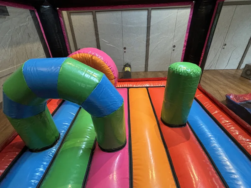 Overall, the bouncy castle combines a compact, low-profile design with bold neon styling and engaging obstacles, making it ideal for children's parties, school events, and disco-style celebrations and the added bonus it's great where height clearance is limited.