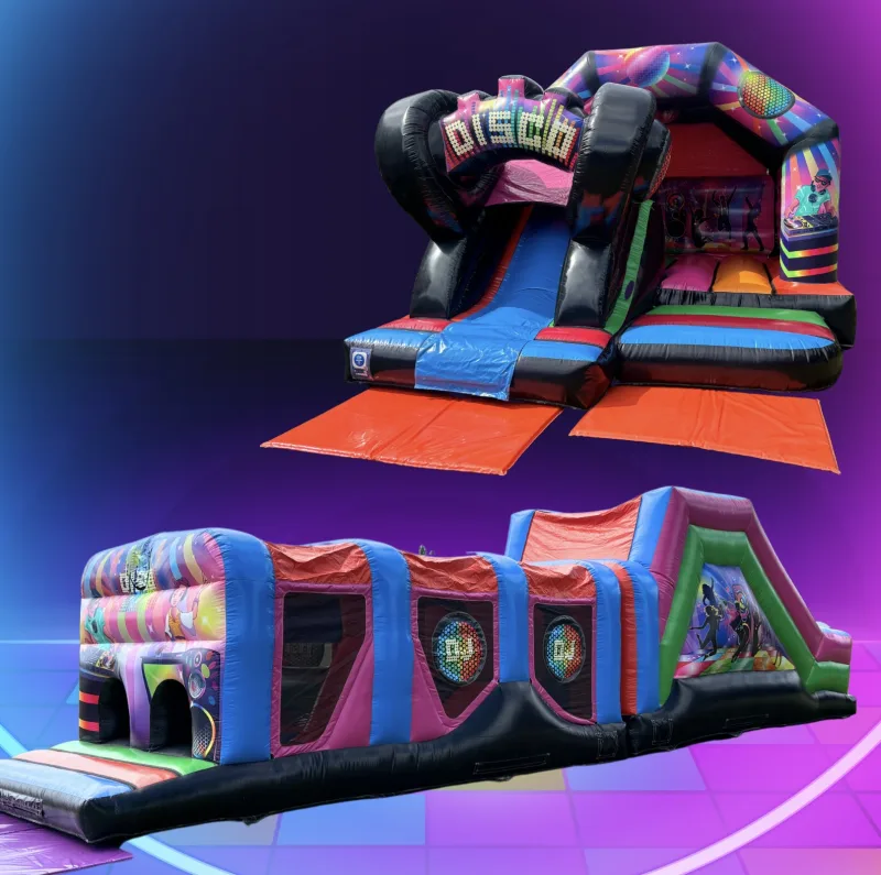 This package includes the Neon 3D Disco Castle and matching Neon disco 42ft Assault course.