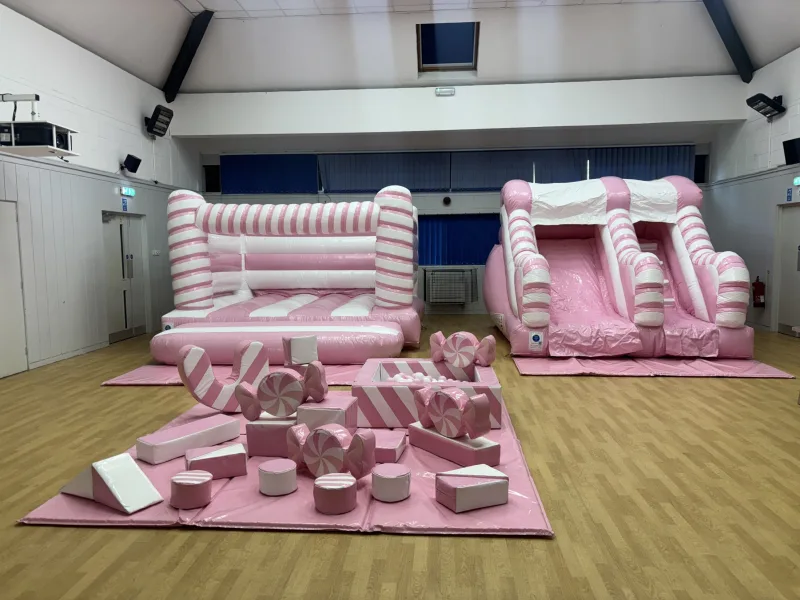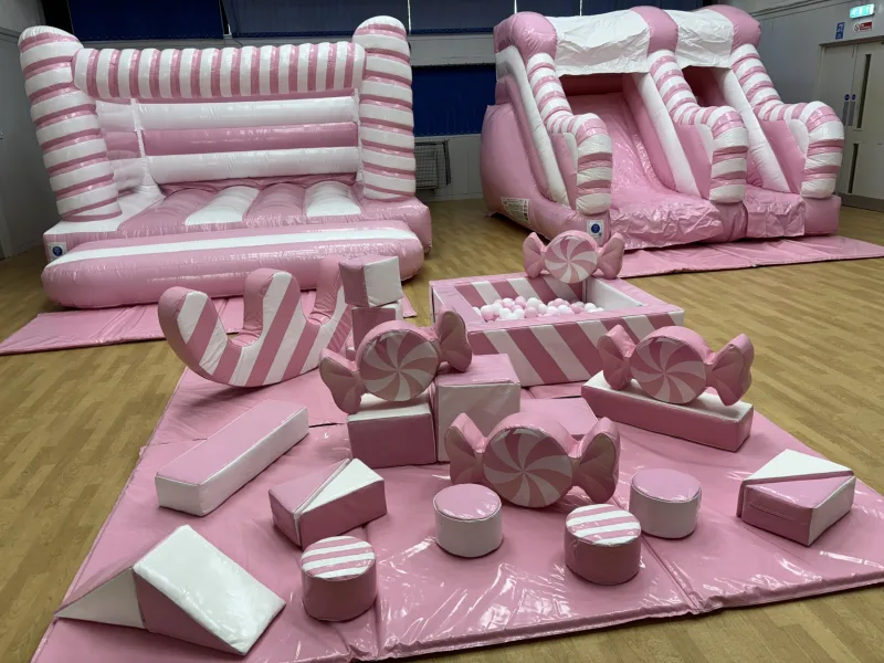 It includes the super popular pink and white Candy twist bouncy castle, The 5ft platform matching pink and white candy slide , the custom made luxury pink and white soft play and ball pit and the 4 large candy soft play shapes!