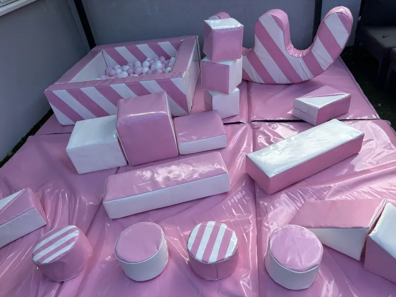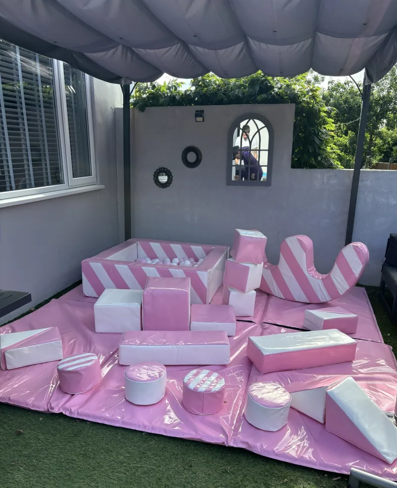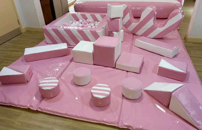 Pink and white luxury soft play set includes a ball pit, soft play shapes and a rocker.